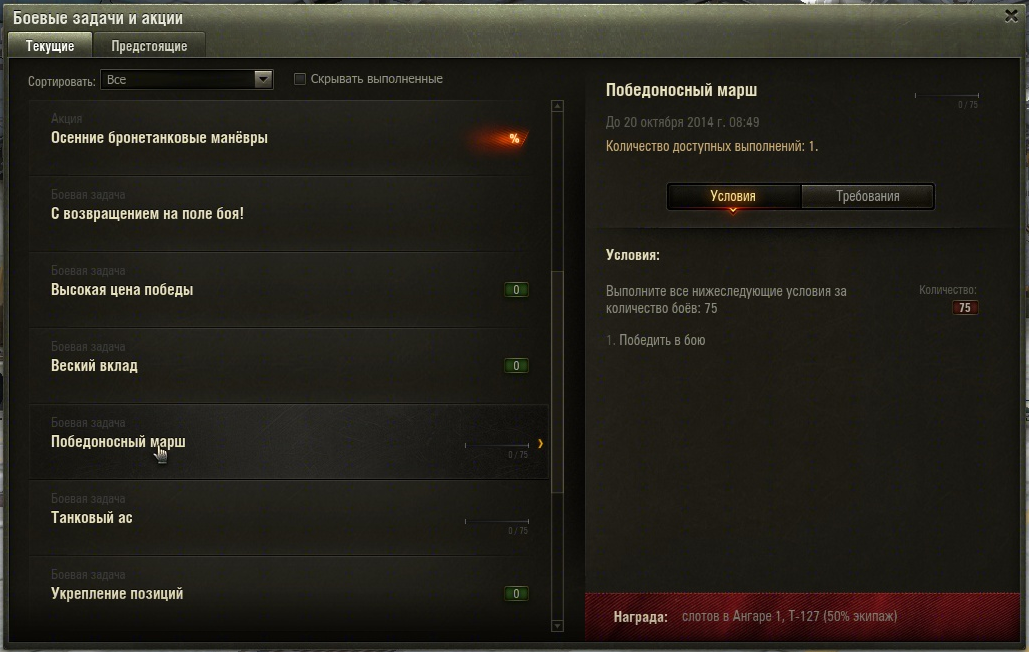 This is how it looks in the client (for 75 victories between 10th and 20th of October, you can get a T-127 and a free garage slot):